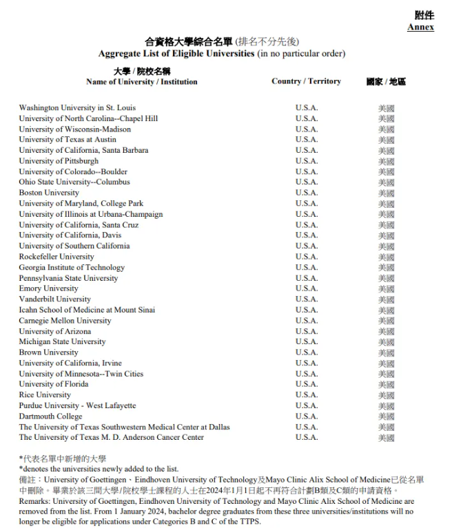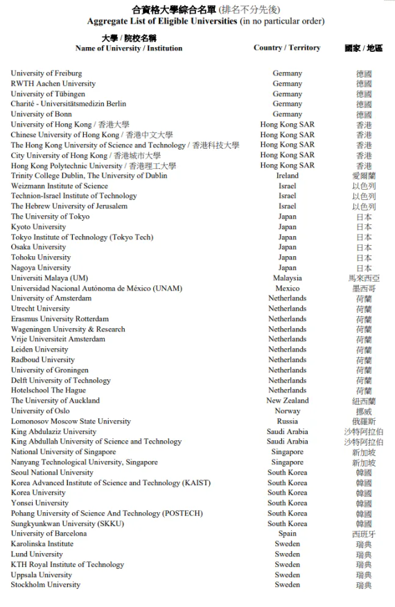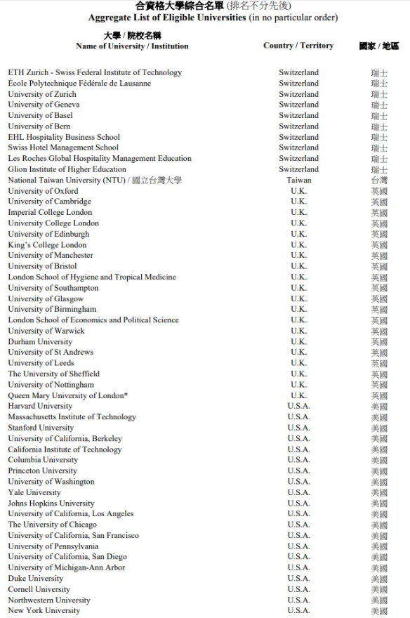 去年更新之前这份名单叫做“全球百强大学综合名单”(Aggregate List of World's Top 100 Universities),更新之后的名单名称改成了“合资格大学综合名单”(Aggregate List of Eligible Universities),这也体现了变更的特点:除全球百强外,香港也欢迎其他非全球百强但是同样属于顶尖高校的毕业校友到香港发展。
